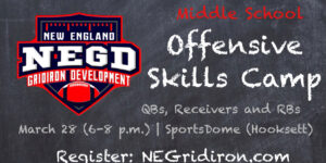New England Gridiron Development will hold a Middle School Offensive Skills Camp on March 28 from 6-8 p.m. at the Autofair SportsDome in Hooksett, N.H. This event is open to …